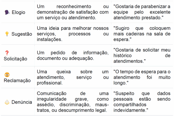 Você pode entrar em contato conosco para fazer diferentes tipos de manifestação:
