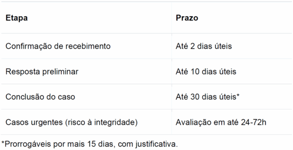 - Guarda: Os registros são guardados por no mínimo 5 anos (10 anos para denúncias graves).